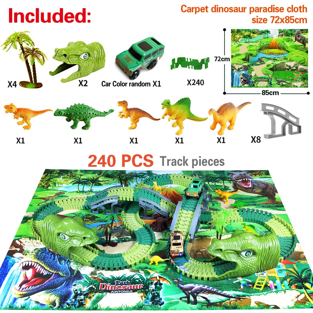 - FOR YOUR DINOSAUR LOVER: Bring the Jurassic World to life and meld it together with the modern world with prehistoric dinosaurs, LED jeep vehicle, and 192 track pieces along with a large play mat.